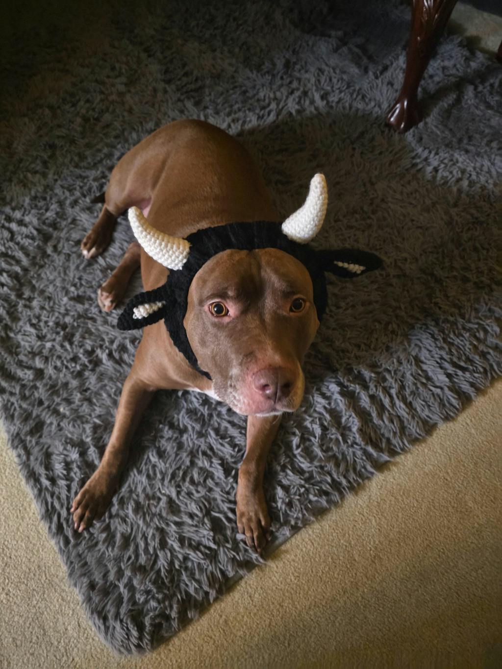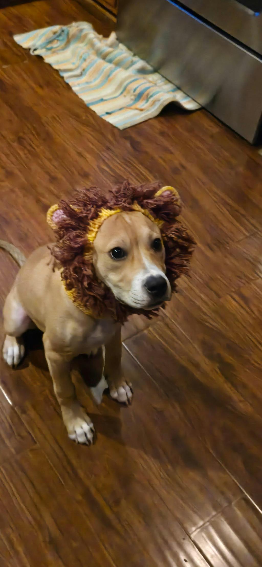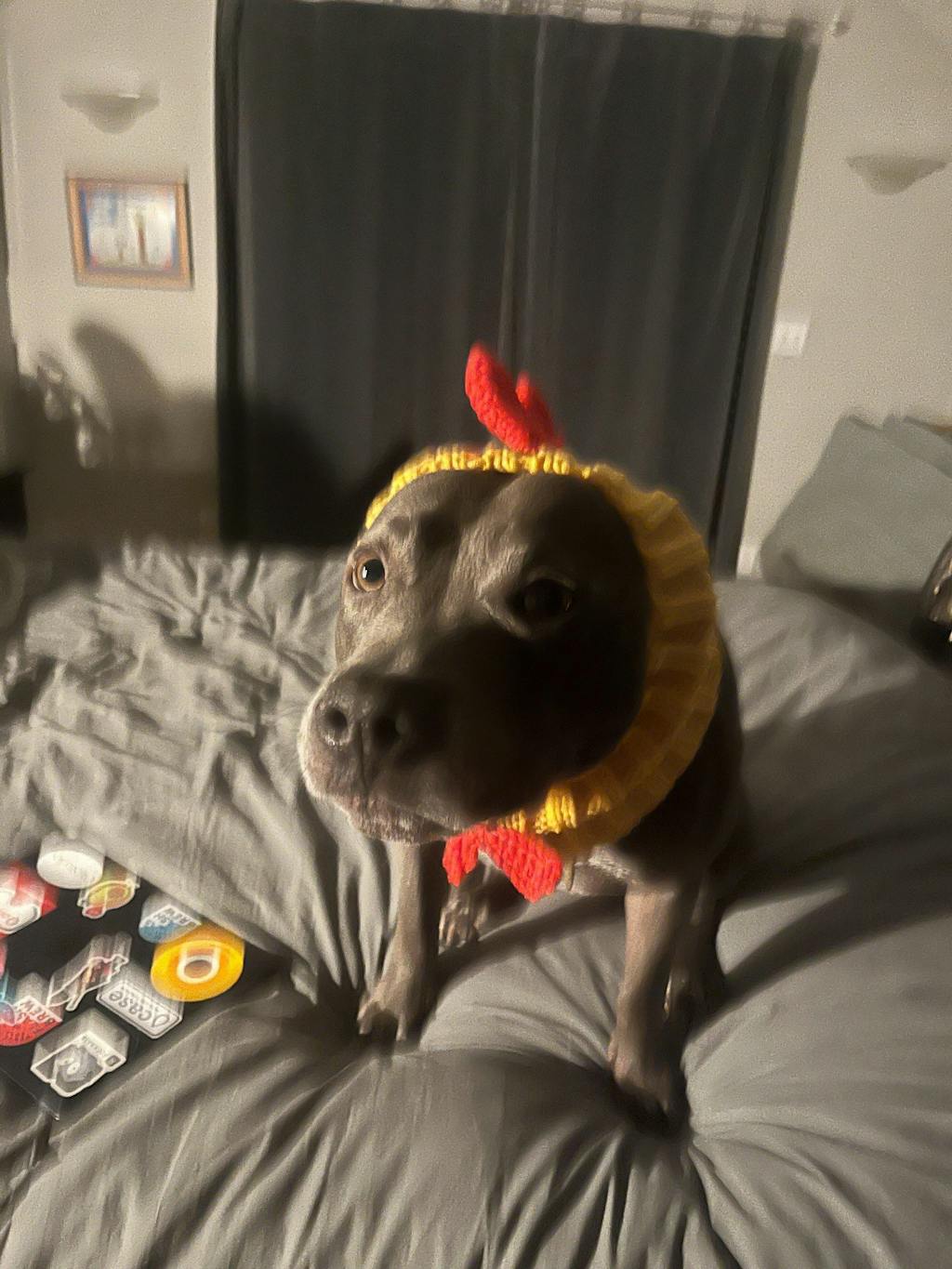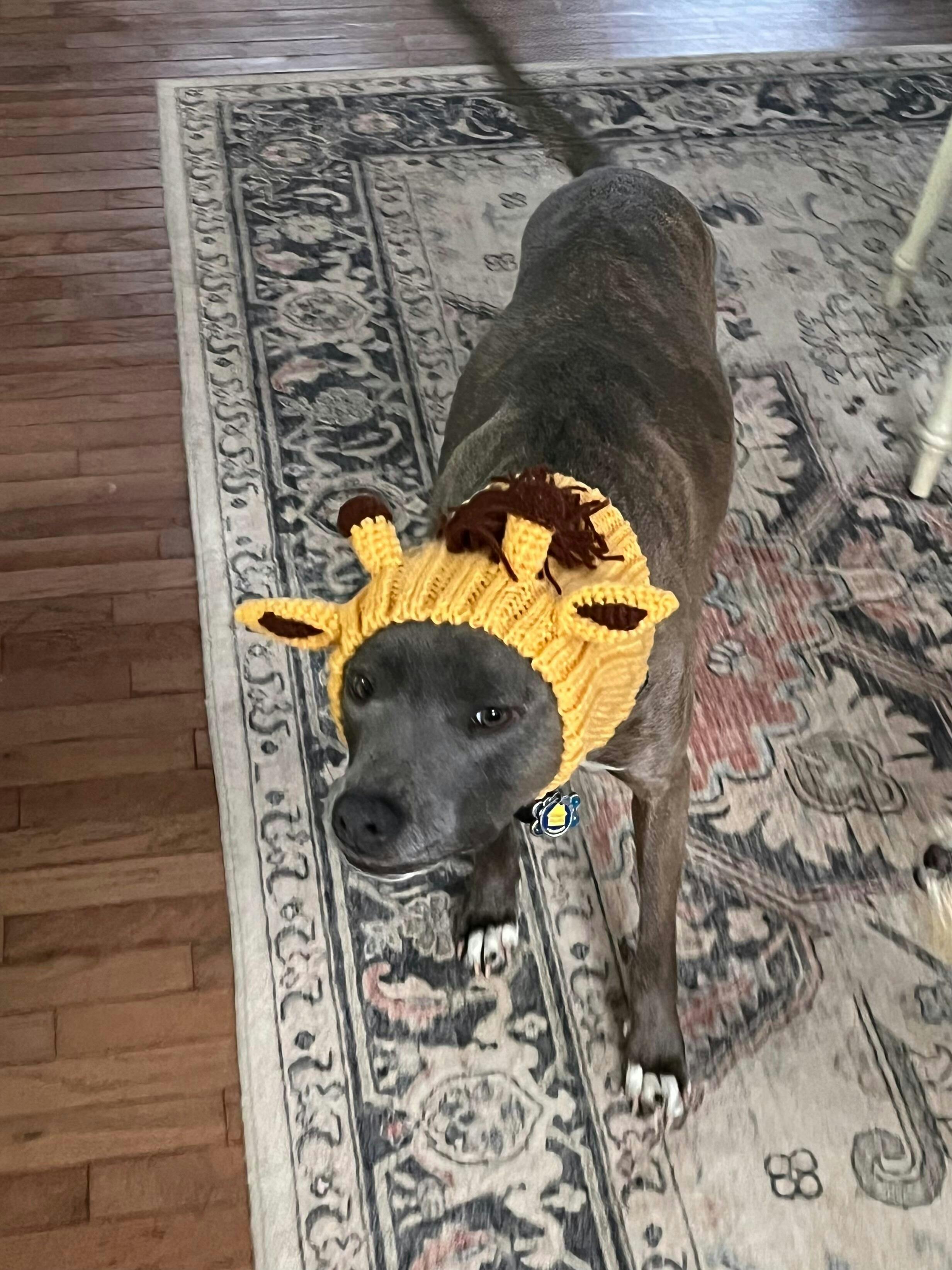 The photo is of Jerry in his chicken snood. He seems a little confused so far but as pit bulls have so little fur, the snood and sweater will help keep him warm on walks in the cool, windy weather. Both are beautifully made and super cute. And he looks adorable in them.