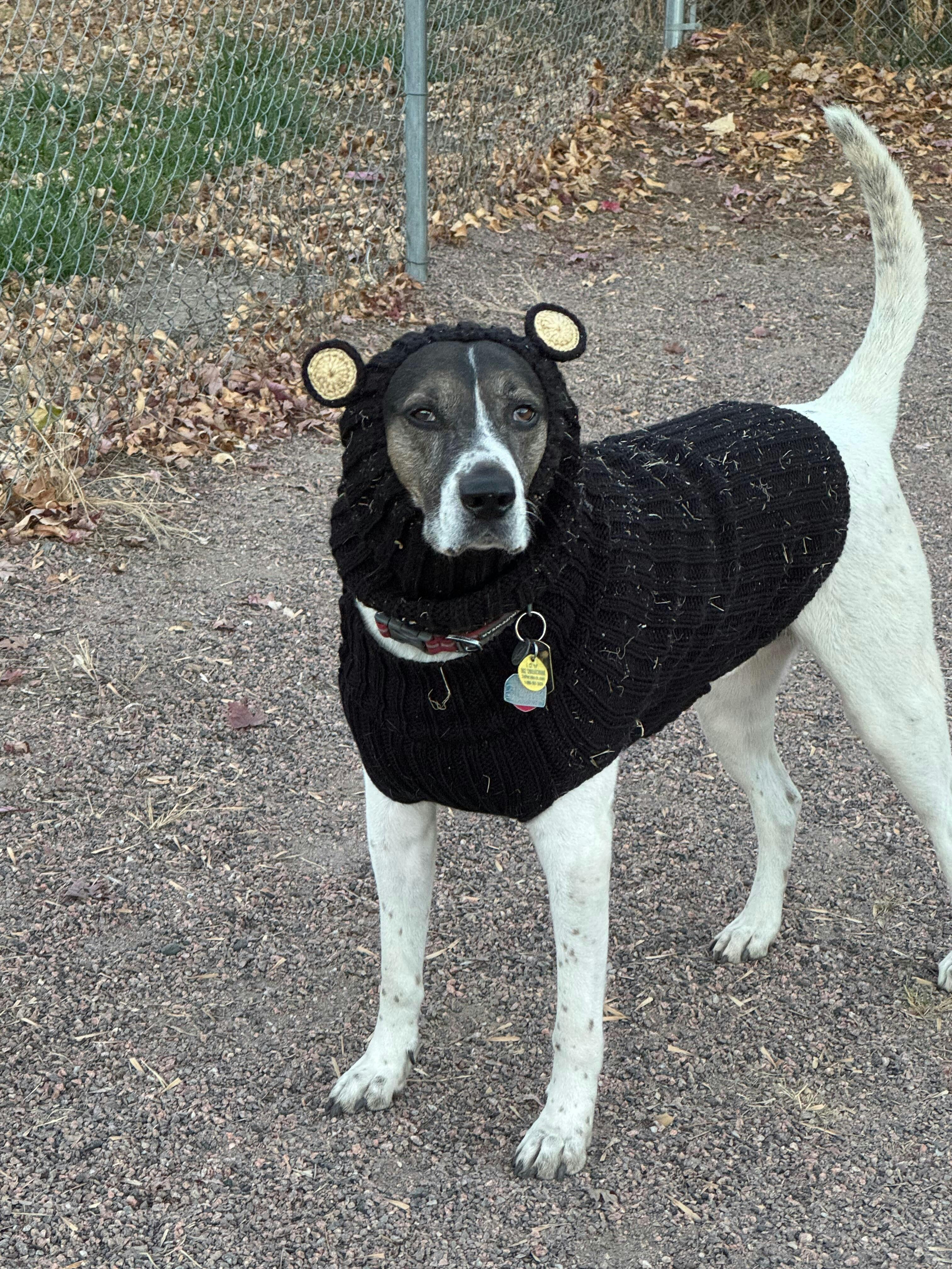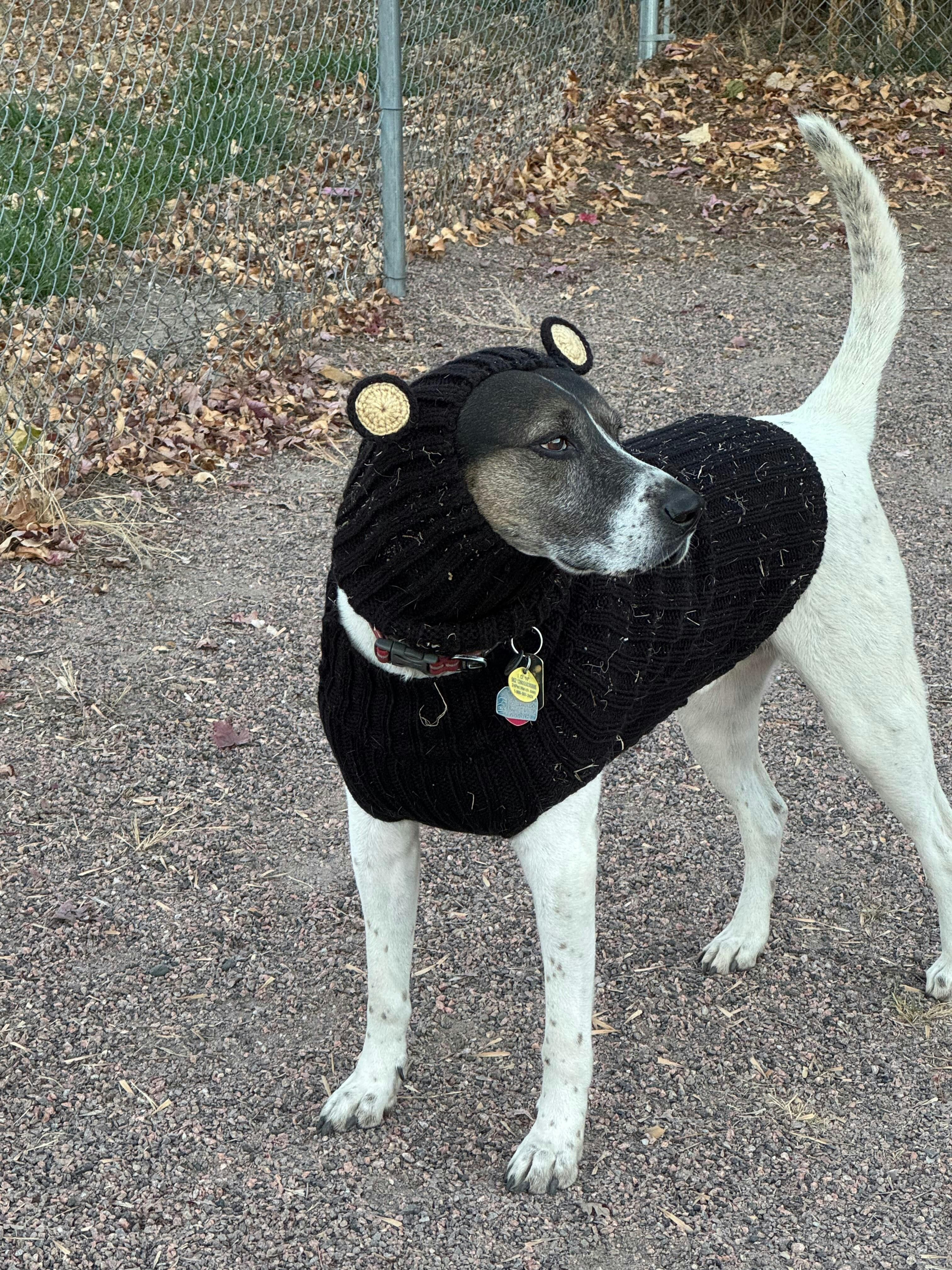 I got the black bear snood and a black sweater for my dog and it was really easy to put on and super cute. Made me laugh and it was so great! He rolls in everything and it was easy to brush off and use a lint roller on for the fine bits of fall leaves. He's a large English pointer mix 80lbs and I got the largest size.