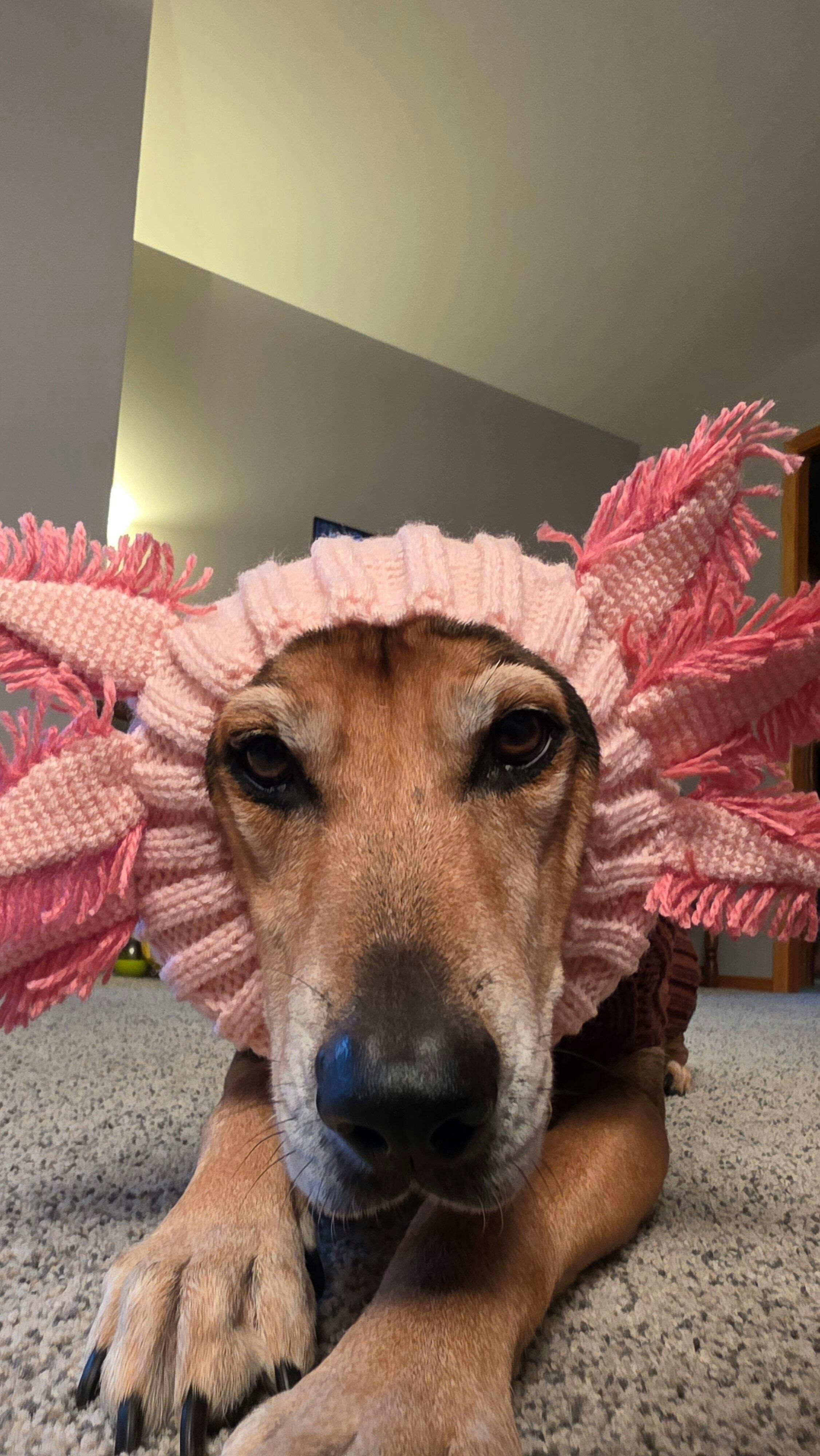Love this snood, super cute and elaborate. Our little fur baby looks perfect!