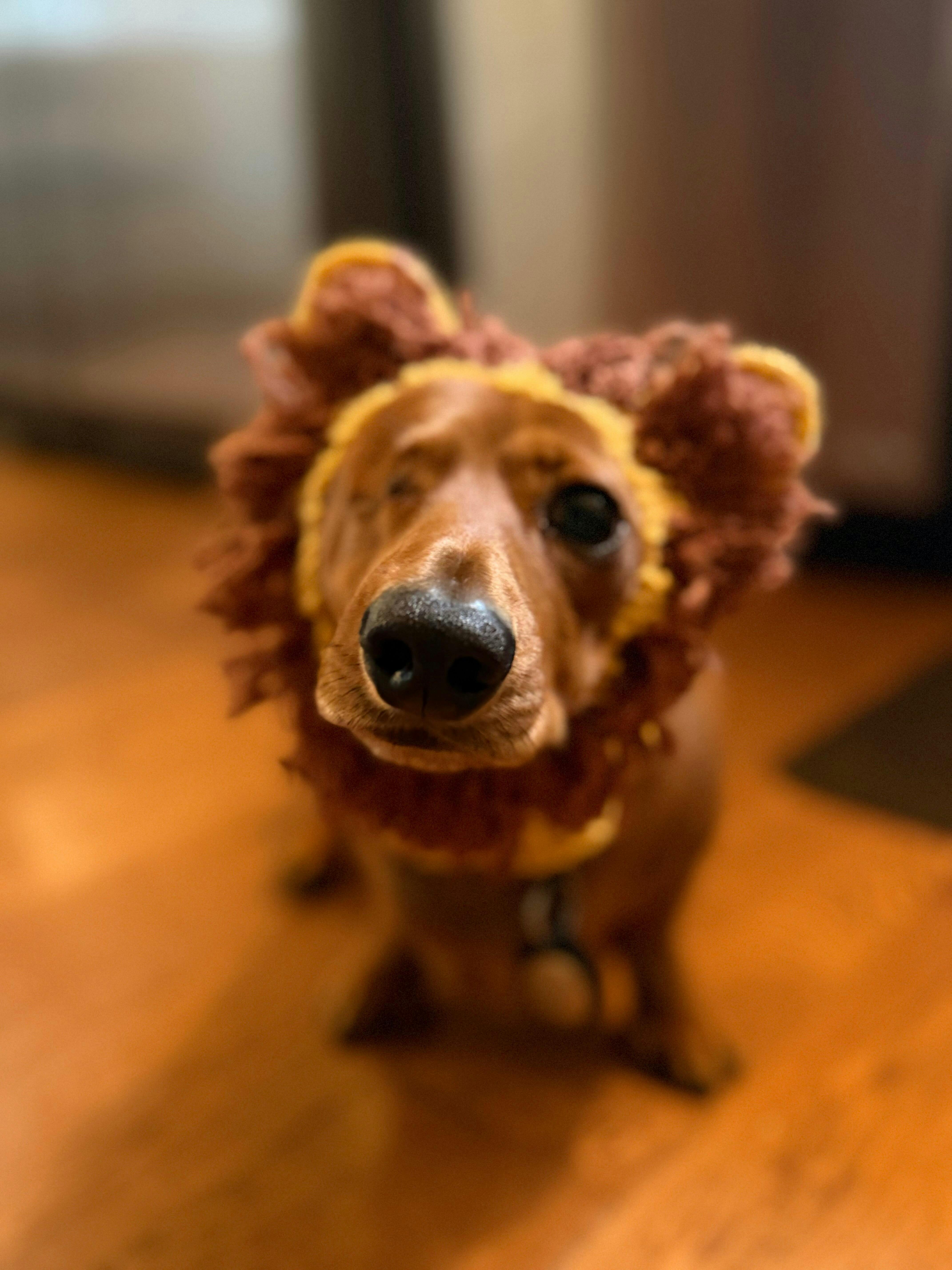 I bought 3 of these, the lion, dinosaur, and the shark. All cute, but there was no way to attach a leash to my dog's collar. Also, it would have been much better if there were front leg wholes. My dog never minds wearing outfits, but this just went over her head, and she pulled it off which she has never done with any costume or jacket that velcro'd at neck and under the belly. But they are so adorable. I am disappointed that she doesn't keep it on and can't take her out walking with one on.